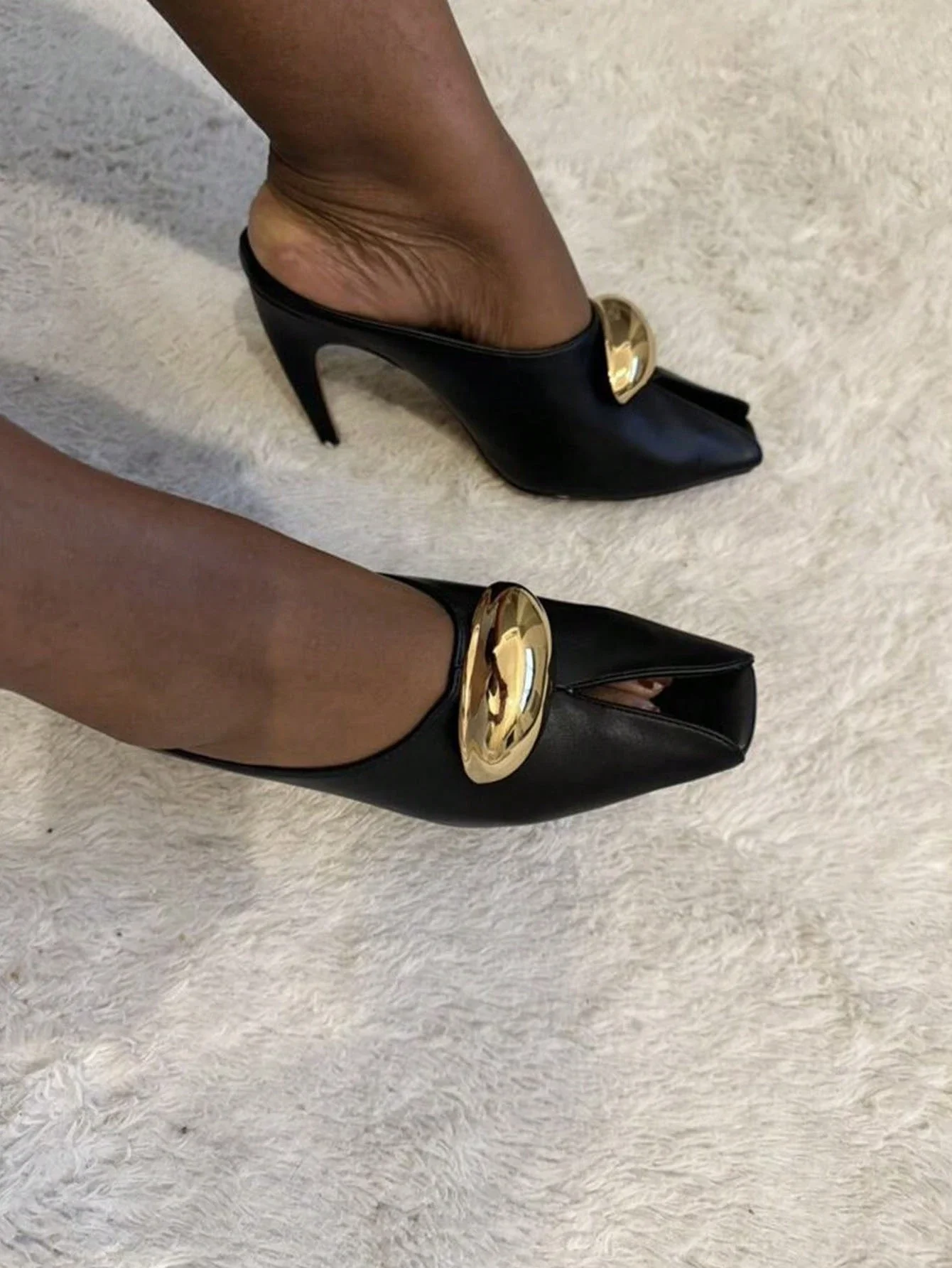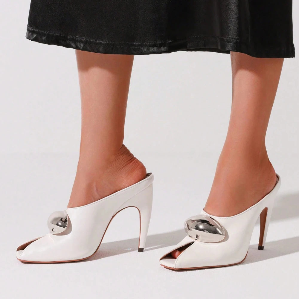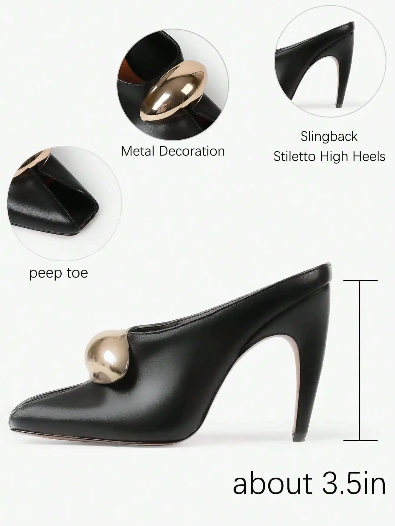 Y2K Metal Decoration Stiletto High Heels Slingback Pumps For Women Solid Peep Toe Slip On Mules Party Dress Sexy Fashion Shoes