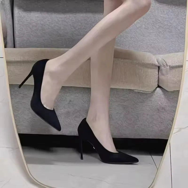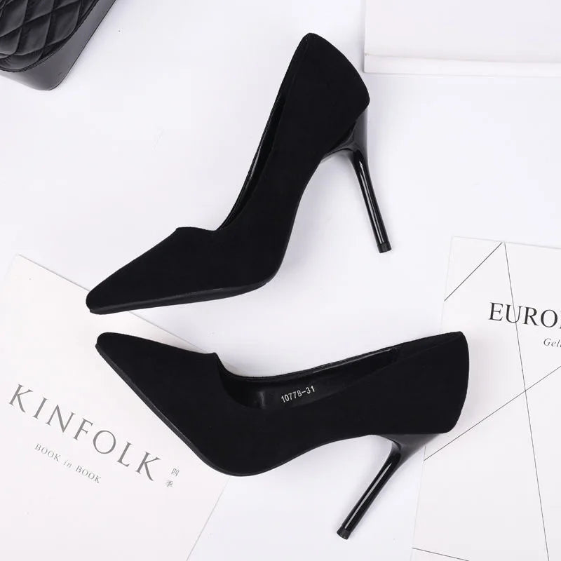 New Fashion Women's Shoes Sexy Black High Heels Sharp Pointed Suede Pumps Elegant Shallow Mouth Etiquette Shoes Mujer Zapatos