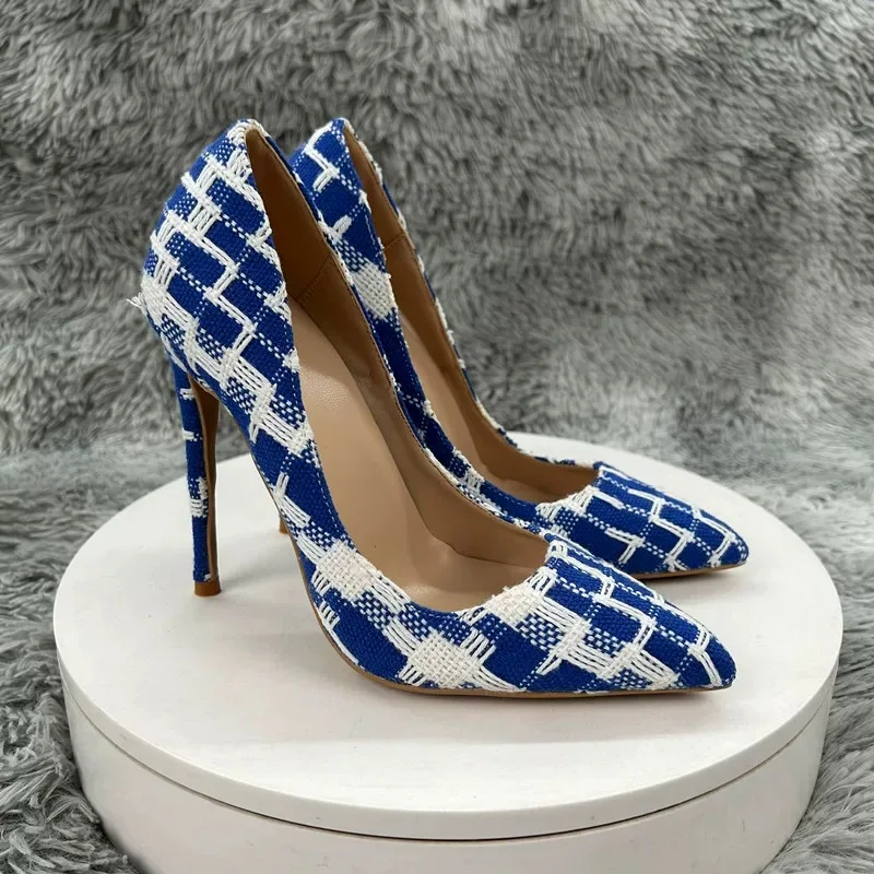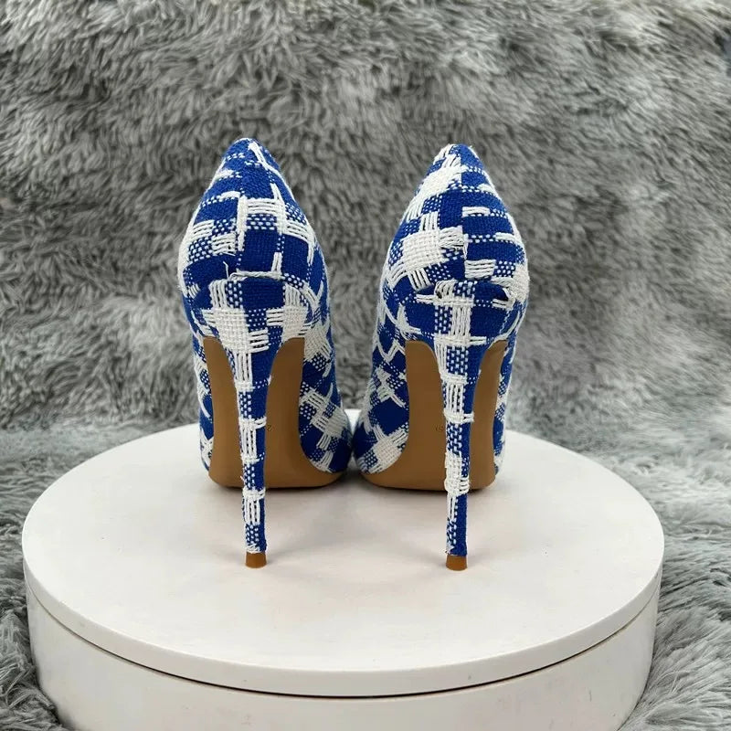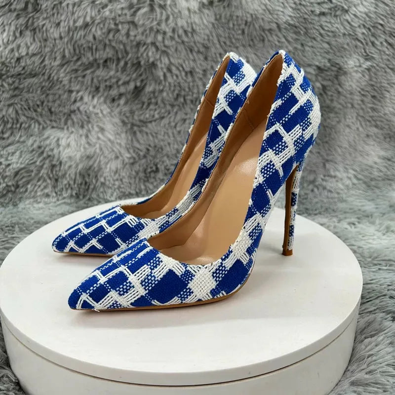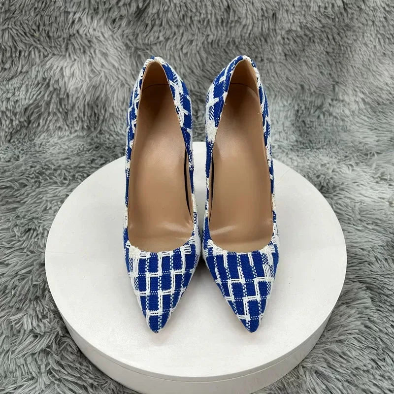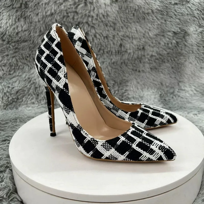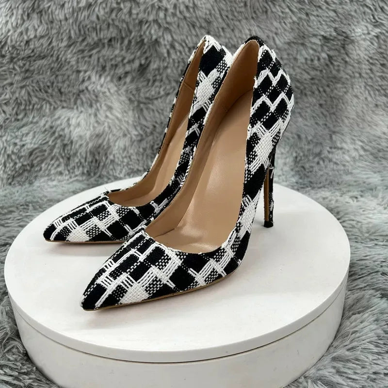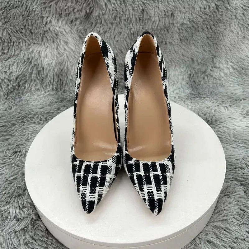 New Elegant Women Pumps 12CM 10CM 8CM Super High Heels Single Shoes Plaid Pattern Pointy Toe Shallow Mouth Commuting Lady