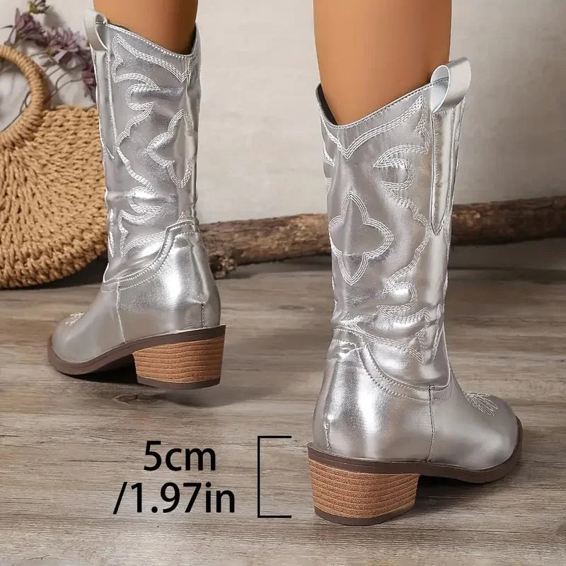 Women's Vintage Embroidered Cowboy Boots - Mid Calf Winter Western Boots with Pointed Toe & Heel | Warm Lined, Festive Style | F